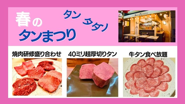 春、新生活を迎える方達を応援したい!そんな思いで、牛タン好きの方や焼肉が好きな方に向けて虎の穴ホルモン 恵比寿横丁店が誇る「和牛の牛タン」を使った新メニュー、新サービスを第1タン(弾)第2タン(弾)第3タン(弾)と、タン、タタン!と大判振る舞いするお祭りです。