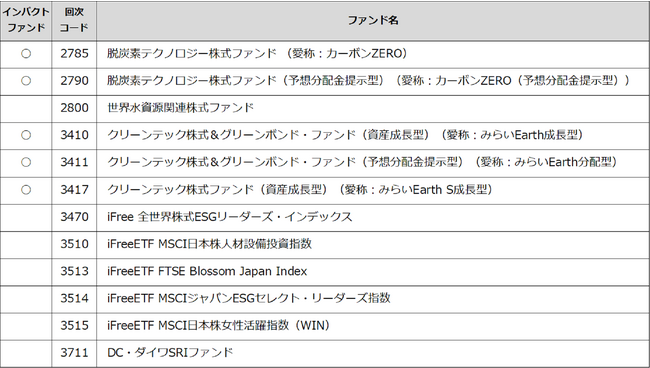 前述の定義に基づく当社の「ESGファンド」は、2022年11月2日付プレスリリースにてご案内の11本および2023年4月3日に新規設定された「世界水資源関連株式ファンド」を併せた12本の公募ファンドとなります。
