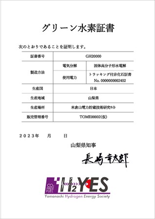 山梨県は、YHCが製造する水素の製造方法を個別に確認し「グリーン水素証書」を発行しますので、これによって弊社の持つ全国最大の水素サプライチェーンの中でグリーン水素の価値を個別に提供していきます。