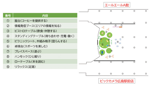 3/22(水)、3/23(木)の2日間(10:00~18:00)は、誰でも利用できるくつろぎスペースとして開放。ハンモックや湯来温泉の足湯でくつろげる人工芝スペース、ちょっとした運動ができるアクティビティスペースのほか、飲食・休憩・読書などに利用できるテーブル・イスなどのファニチャー類、コンセントを配置しスマホの充電や仕事に使えるスタンディングテーブルなどを設置します。無料でのコーヒー提供もあり、どなたでも、自由にご利用できます。