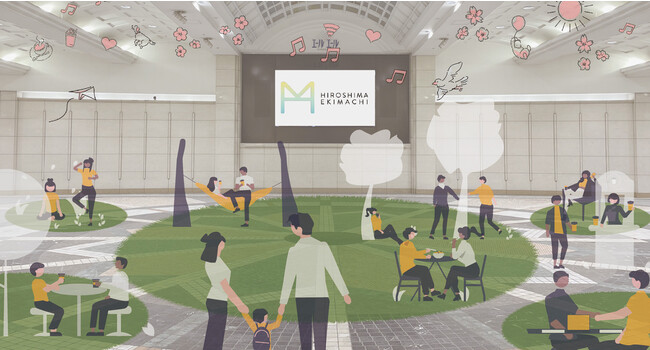 広島駅南口地下広場では、イベント広場の周りへのパネル設置による「たまりの空間」を創出。「駅」「街」「待ち(合わせ)」「地下」「近(い)」などの意味を持たせた『エキマチカPLACE』と名付け、ホール空間としてのイベント利用や、日常的なくつろぎスペースとしての活用の可能性を検証します。