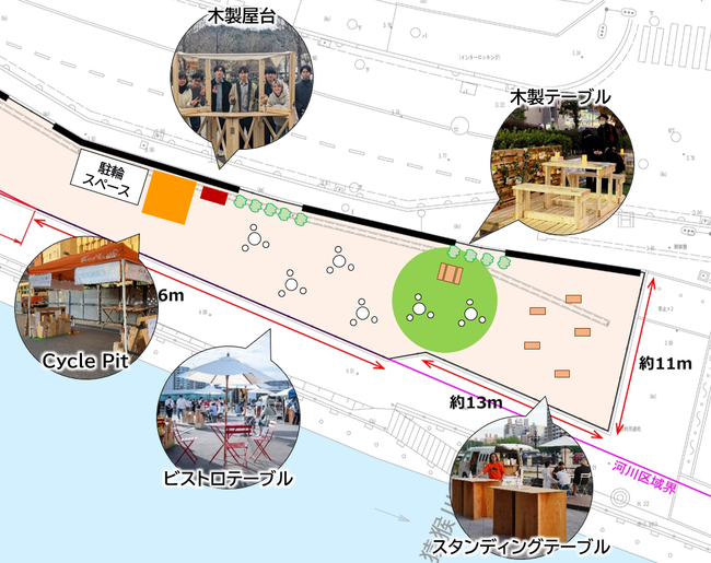 猿猴川水辺広場(仮称)では、3/20(月)から3/25(土)の6日間(10:00~18:00)、1月より社会実験として設置中の自転車利用をサポートするスペース「Cycle Pit」を拡大。これまでの自転車用空気入れ(英・米・仏バルブ対応、無料)に加え、人工芝や植栽のほか、テーブル・イス等のファニチャーを設置し、自転車利用中の休憩スペースとしての活用を図ります。無料でのコーヒー提供もあります。