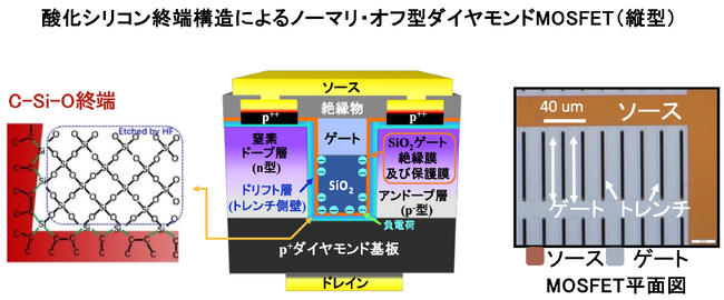 今回、われわれはダイヤモンド表面を酸化シリコン (C-Si-O)で覆う新たなデバイス構造を開発しました。