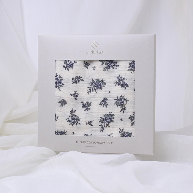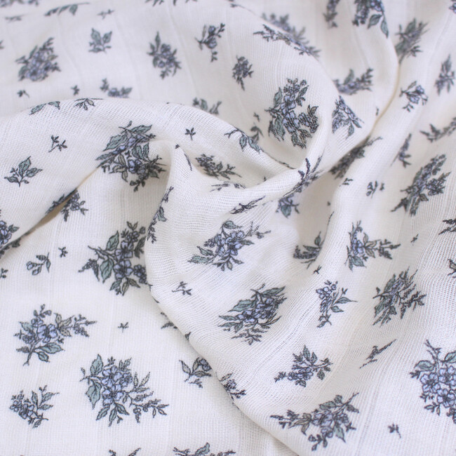 アイボリーの背景色にブルーの小花柄が、落ち着いた雰囲気を演出するおくるみ(スワドル)です。「男の子でも使えそう!」「甘くなりすぎないところが嬉しい♪」と、現役ママからも人気が高いデザインです。