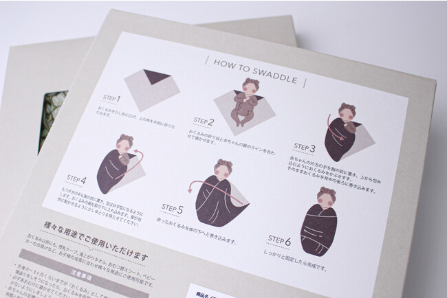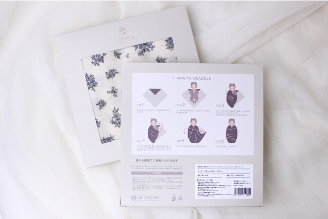 裏面にはスワドルの基本巻きのイラスト付きで、スワドルを初めて手にする方にも分かりやすいように配慮しています。Anliette(アンリエット)の『花束スワドル』の入手方法はWeb限定のため、送料が負担とならないようメール便で安価に送ることができるように、パッケージサイズにもこだわって開発しました。