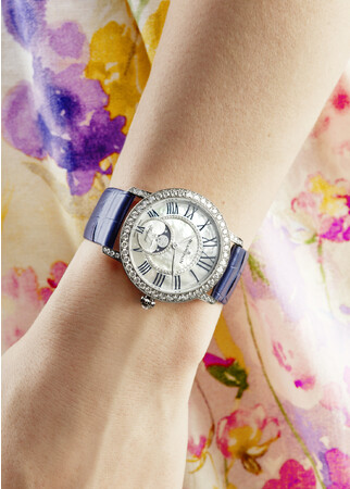レディバード カラーズの新モデルに特徴的なビジュアルのバランスは、すべてのダイヤル要素に見られ、アシンメトリーなタッチでさりげなく施されています。オフセットのローマ数字は、丁寧にあしらわれたジェムセッティングのインナーリングによって強調され、スモールセコンドやムーンフェイズ表示まで続いています。カラフルなタイムピースそれぞれの特性を主張する、もうひとつの方法です。