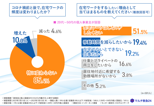 そこで今回、在宅ワーク専門求人サイト「PR市場」(https://job-link.jp/)を運営する、「マルチ救急24」は、中小企業(従業員100人以下)の経営者と20代~50代の個人事業主それぞれ500名ずつを対象に、「経営者と個人事業主のこれからの働き方」に関する調査を実施しました。
