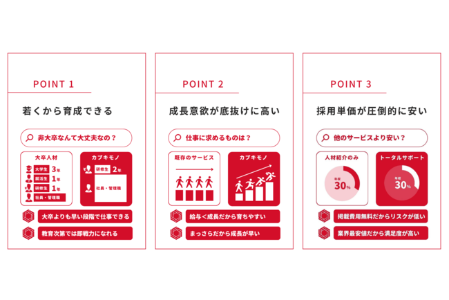 カブキモノキャリアは「個性を採用する時代をつくる。」をビジョンとして、若い × 熱い × 想いの3つを柱とした採用戦略で、日本の中小企業の採用課題を解決するサービスです。