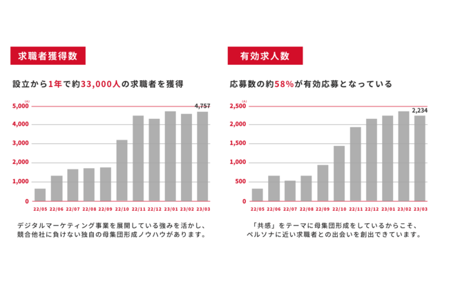 デジタルマーケティングのノウハウが豊富なマーケッターが社内に在籍しており、なおかつ求職者・企業と徹底的に向き合えるキャリアアドバイザー・セールスコンサルタントあってこその実績であると自負しております。