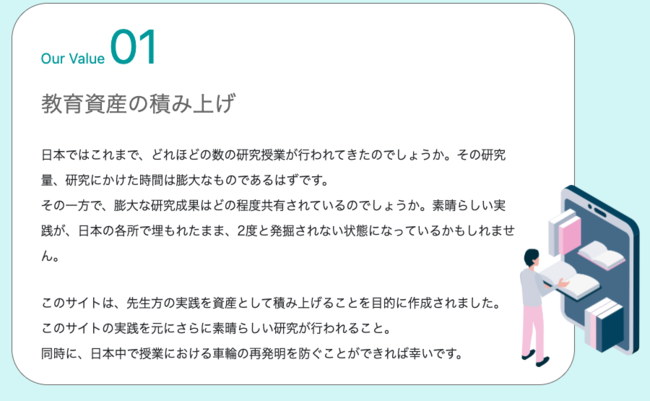 日本中で行われる素晴らしい教育実践の数々は、地域内・都道府県内レベルの共有に留まることが多くなっています。そのため、日本全国で同じような研究に労力が割かれる可能性や、有効な実践が共有されにくいという課題があります。
