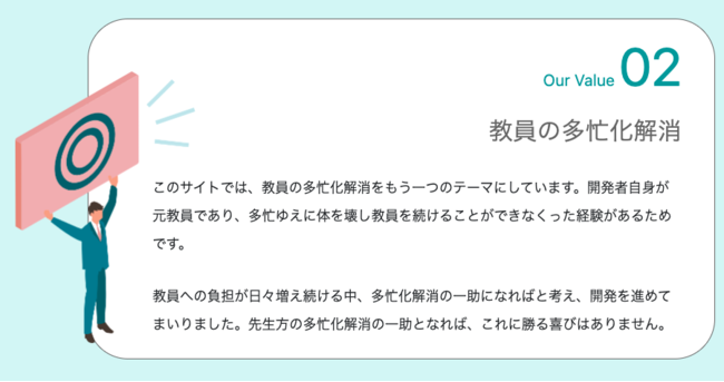 今現在も現場に立つことは難しいですが、このサービスが少しでも教育界に貢献できるのであれば、これ以上の喜びはありません。
