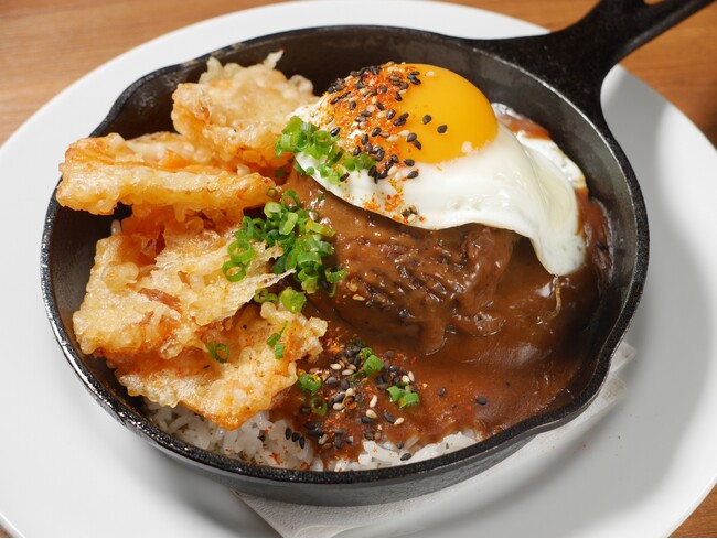 ハワイアンフード「ロコモコ」にキムチの天ぷらのトッピングしたオリジナルメニュー。ご飯はガーリックライスを使用。