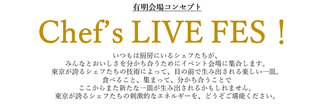 有明会場では、シェフたちの想いやこだわり、情熱をみなさんに直接届けていくことで、“東京の食”の価値をさらに高めていくことを目指し、“Chef’s LIVE FES!”をコンセプトとして掲げて開催いたします。