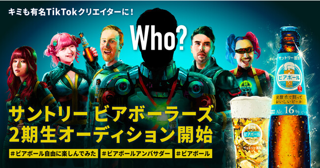 応募期間は2023年3月24日(金)~5月7日(日)で、エントリーの際は「#ビアボール自由に楽しんでみた」「#ビアボールアンバサダー」「#ビアボール」の3つのハッシュタグをつけて、「ビアボール」を自由に楽しむ動画をTikTokにご投稿ください。オーディション合格者は6月に発表予定で、1期生と共演できるTV-CM・WEB CMへの出演など、「ビアボール」を自由に楽しみながら活動していただきます。さらに、素敵な動画を上げてくださった方には「ビアボール」を自由に楽しむサントリー炭酸ドリンクセット1年分をプレゼントします。