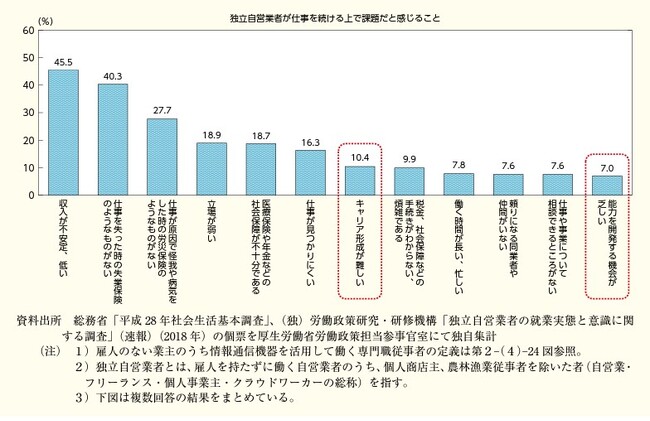 今後も介護や家庭と仕事を両立するために、新たな働き方の選択肢としてフリーランスや個人事業としてスモールビジネスを始める場合、一人では孤独であり、スキルやキャリアアップも難しい現状があります(別表参照)。だからこそ、共に分かち合い、成長できる仲間の存在が重要です。人生の後半をスタートするにあたって、一人ひとりが人生を見つめ直し、キャリアを立て直す。それぞれが能力を発揮できる場所を見つけることは、個人の充実感のみならず、社会全体の活力の維持にもつながると言えます。