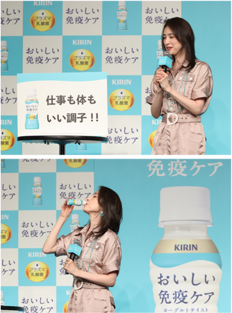 続いて、売上好調の『キリン おいしい免疫ケア』についてのトークでは、「(発売後1週間で)すごくないですか!みなさんありがとうございます!このままどんどん行っちゃいましょう!」と天海さんがコメント。天海さんの『おいしい免疫ケア』と同じくらいいい調子なコトについては「仕事も体もいい調子!!」と発表。「撮影現場や舞台が毎日重なると精神的にも大変な時はあるのですが、毎日朝飲んでいると、体調がとてもいいです。うるさく舞台仲間にもおすすめしていて、今のところ現場も舞台も全て順調に進んでおります。誰1人お休みすることなく、一役を担うことができているのかと思います」とご自身のエピソードを紹介しました。