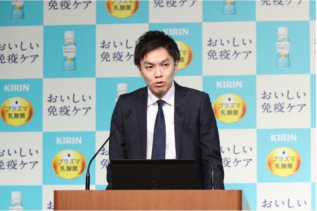 当日は、キリンビバレッジ株式会社小西裕太より、キリングループのヘルスサイエンス事業の取り組みや『キリン おいしい免疫ケア』の販売状況を発表しました。