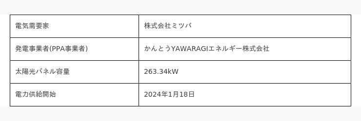 かんとうYAWARAGIエネルギー株式会社(代表取締役 三村挑嗣、以下「当社」)は株式会社ミツバ(代表取締役 北田勝義、以下「同社」)と2023年6月にオンサイトPPA*モデルによる契約を締結し、同社赤城工場の屋上に太陽光発電システムの設置を進めてまいりましたが、この度設置が完了し、再生可能エネルギー電力の発電を開始しましたので、下記のとおりお知らせいたします。