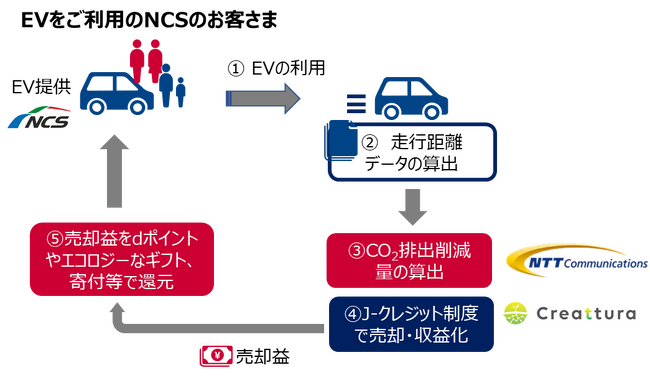 本実証実験では、NCSがリースで提供するEVをご利用中のお客さまに対し、EVで走行した距離を測定の上、その走行距離に応じて、発生した温室効果ガス削減量をJ-クレジット制度を用いてクレジット化します。それを原資としてお客さまにdポイントやエコロジーなギフト、社会貢献の一環としての寄付などで還元する予定です。また、取得できる移動データを活用した、新たなビジネスの可能性も検証します。