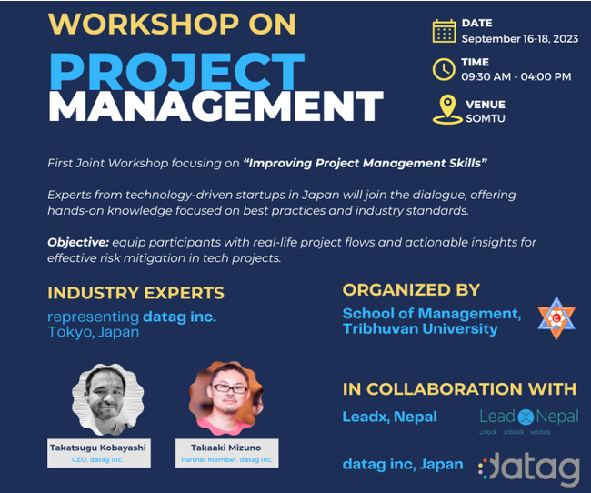 データドリブン・プロジェクトマネジメントのグローバルカンパニーであるdatag株式会社(本社:東京都目黒区、代表取締役CEO:小林孝嗣)は、ネパール最高学府のトリブバン大学経営学部において、2023年9月16日(土)から9月18日(月)の3日間に行われた、ワークショップの開催レポートを発表いたします。