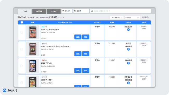 鑑定済みトレカ専門プラットフォーム「カルドバ」では、こういった状況下でも安全・安心・速やかにトレードや取引を楽しんでいただくために「保管」サービスを開始します。