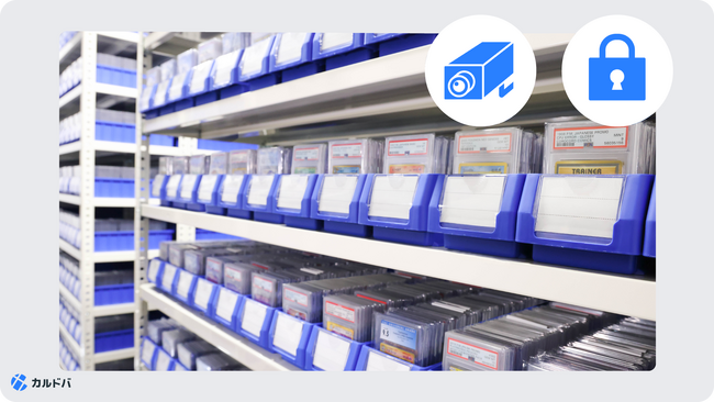 鑑定済みトレカをカルドバにお送り頂くことで、美術品のように最適な温度、湿度【室温20°C、湿度50%】で保管し、貴重なカードを経年劣化から守ります。さらに警備会社と提携し、保管庫や事務所には防犯カメラも完備。24時間365日、高セキュリティな防犯体制を敷き、万が一の盗難や災害に備えた補償制度も設けております。