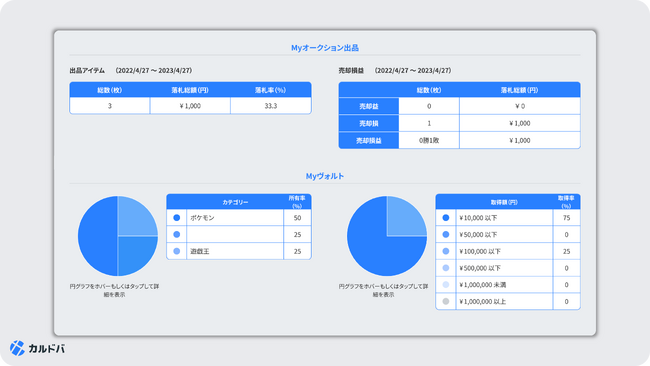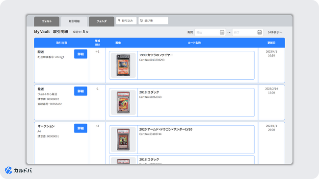 カードの入手日や購入額は、過去の取引も含めてすべて記録。「取引履歴」では、ヴォルトに入ったカード(カルドバへ配送・取引で入手)や、ヴォルトから出て行ったカード(自宅に配送・取引に出品)が一目でわかるので、電子通帳や証券口座のようにトレカを一元管理してみてはいかがでしょうか。