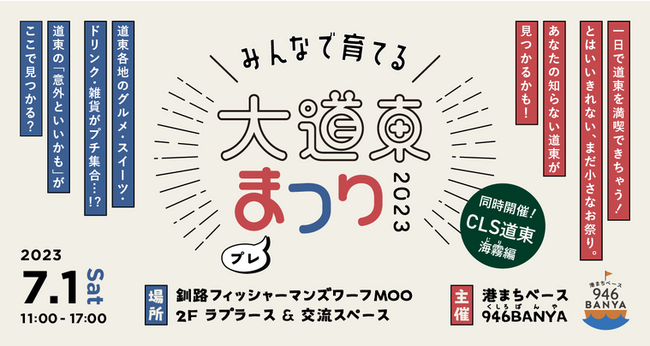 合同会社Hokkaido Design Code(本社:北海道釧路市、代表社員:四宮琴絵、以下 HDC)と、釧路の街および道東を愛する共創メンバーが共同で運営する、北海道釧路市の共創スペース「港まちベース 946BANYA(くしろばんや、以下 946BANYA)」が、グランドオープンを記念し、道東のプチ物産展「みんなで育てる 大道東まつり」を7/1(土)に開催します。当日は釧路や厚岸、弟子屈など道東各地で人気の飲食店や体験コンテンツが集結。また道東で活躍する、もしくはゆえんのあるリーダーが集まる「CLS道東 海霧(じり)編」も同時開催。祭りという形で地域の方々とともにオープンを祝うイベントを実施します。大道東まつりは入場無料、CLS道東は有料で参加申し込みが必要です。