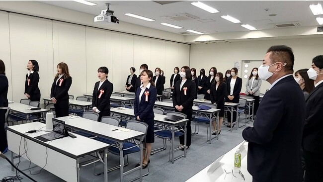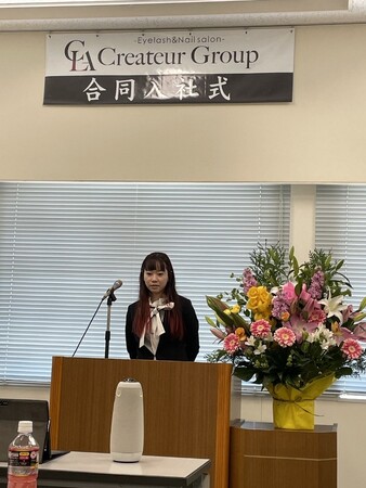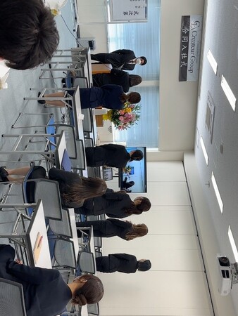入社式では、会長及び役員の祝辞、新入社員代表からの抱負、先輩社員からの激励の言葉がありました。5年間で全国100店舗出店に挑むクレアトゥールグループ。乙津健太朗代表は「本年は5ヶ年計画の最終年を迎え、100店舗出店にて締めくくりたい」と力強い言葉を述べられました。入社式の様子