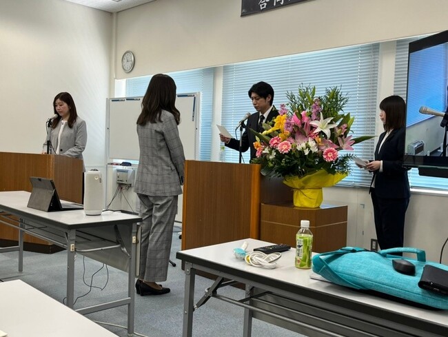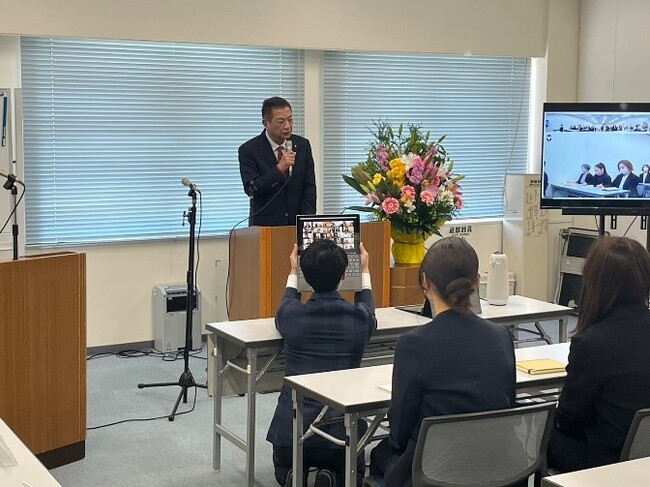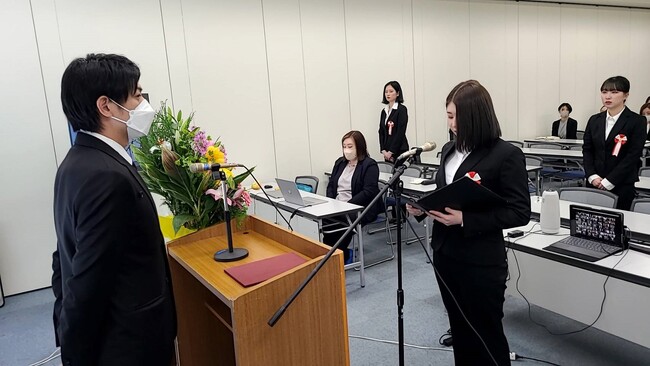 入社式後、飯田部長をはじめ22名へ辞令の交付が執り行われました。今回の人事にて、新たに九州支社に大賀支社長、四国支社に新田ディレクターの就任が発表されました。辞令交付式の様子