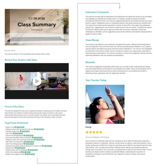 これにより、ユーザーはレッスン中に自身が練習したヨガポーズと講師からのアドバイスを振り返る動画つきレポートを、すべてのクラスで受け取れるようになりました。