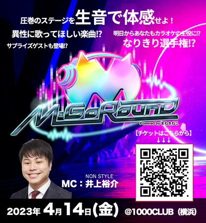 カラオケまねきねこが2023年4月14日(金)より、ライブ会場だけでなく、全国のまねきねこのカラオケルームでもライブビューイングで楽しめる新しい感覚のイベントをスタートいたします。新感覚!音楽バラエティーFes.「M-Go Round Powered by まねきねこ」と銘打って、次世代を担うアーティストをゲストに迎え様々な企画を展開していきます。「ミニライブ」や「なりきり選手権」…、そして、知られざるアーティストの素性をMCのNON STYLE井上裕介が掘り起こしていきます。第1弾「M-Go Round Vol.1 Powered by まねきねこ」のゲストアーティストは、今アイドル界を席巻するAppare!と2.5次元コスプレダンスユニットのアルスマグナです。