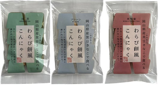 津山市で蒟蒻の加工および販売を行なう。今回は岡山県産黒豆黄粉とわらび餅風こんにゃくを合わせた和風スイーツを販売。やわらかい食感の蒟蒻に、奄美諸島のきび砂糖と瀬戸内の塩をブレンドした香ばしい黒豆黄粉との相性がマッチする。