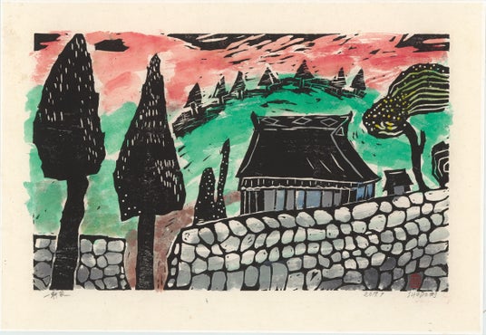 現住職の岩垣正道氏が真庭市久世で廃寺寸前だった曹洞宗のこの寺に入山。写経にと始めた趣味の版画を襖に貼ったのをきっかけに、今では襖絵、天井絵、掛け軸など300点余りを展示して「版画寺」として有名になっている。