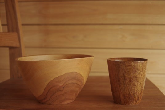 美咲町の山の中に建てた工房で木工旋盤を使用して木の器やカトラリーを制作。庭木や街路樹など伐採された未乾燥の生木を「グリーンウッドターニング」という手法で、日々の生活の中で身近な森や自然に目を向けてもらえることを願って製材から塗装仕上げまで行う。