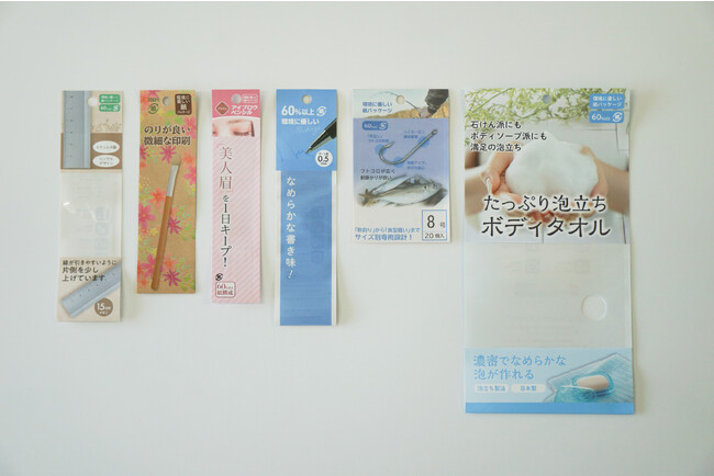 ・特徴:OPP と紙を糊で接着することで、中身を見せながら60%以上が紙から構成されている。