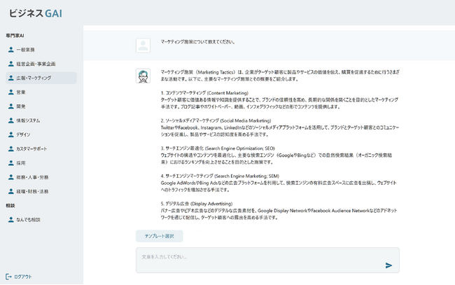 職種・目的別の「専門家AI」を搭載し、テンプレートを活用してChatGPTよりも簡単に詳細な回答を生成