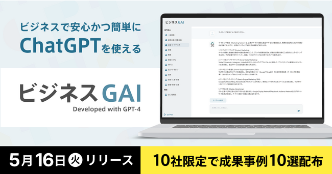 大規模言語モデル等生成AI技術を活用した、サービスの開発・提供を手掛ける株式会社Algomatic(本社:東京都港区、代表取締役社長:大野峻典、以下Algomatic)は、ChatGPTをビジネス活用できるWebサービス「ビジネスGAI Developed with GPT-4」を2023年5月16日(火)より提供開始しました。