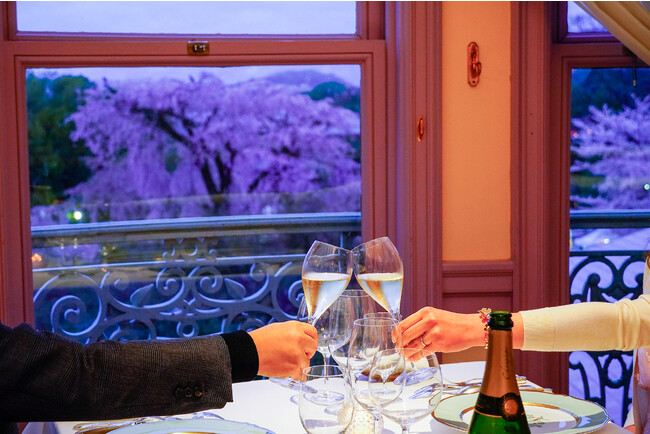円山公園に隣接する、長楽館内のレストラン 長楽館FRENCH LE CHENEでは、2023年3月26日(日)~4月5日(水)の期間、円山公園の祇園枝垂桜に面した1室を貸切りでフレンチコースを楽しむ1日1組限定のディナープラン「夜桜プライベートディナー」を販売しました。当プランは地元京都・円山公園の景観保全を目的としたディナープランで、株式会社長楽館は当プランの売上の一部¥105,000を祇園枝垂桜保全のため京都市建設局南部みどり管理事務所へ寄付いたしました。