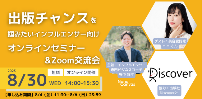 インフルエンサー専門ビジネスコーチ「野中祥平」が主催する、「出版チャンスを掴みたいインフルエンサーのためのオンラインセミナー&Zoom交流会」が、8月30日に開催されます。イベントには出版社「Discover21」の編集者と出版経験豊富なゲストインフルエンサー「美容愛好家 mimi氏」が登壇。出版チャンスをつかむためのヒントや、インフルエンサーとしての信頼性を上げる事例などが紹介されます。参加したインフルエンサーのメリットは「編集者に出版の企画相談ができる」ことと、「同じグループになったインフルエンサーさん同士の横の繋がりを作れる」こと。