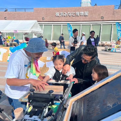 8種類のデザインからお好きなものを選んで、白Tシャツまたはタイダイ染めTシャツにセルフプリントができます。ご家族やお友だちで、横浜を訪れた記念に、オリジナルTシャツ作りを体験してみてください。
