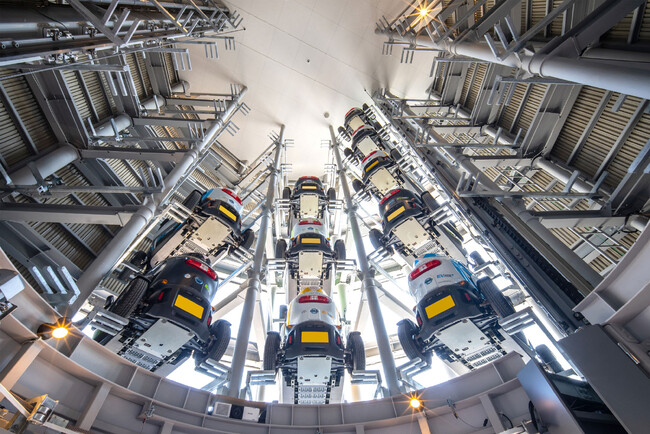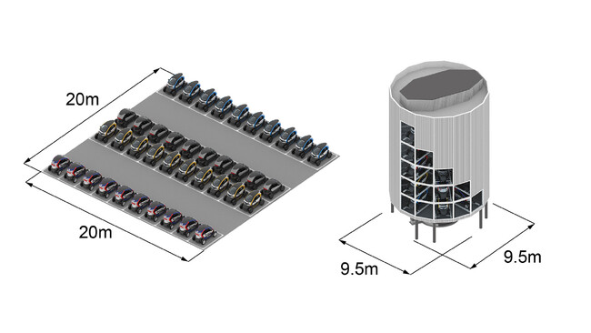➤直径9.5m、高さ15mの円筒型で、占有面積は約80平方メートル とコンパクト。収容台数は40台(1層8台×5層)と大容量です。一般的な平置き駐車場の約5分の1しか占有しません。