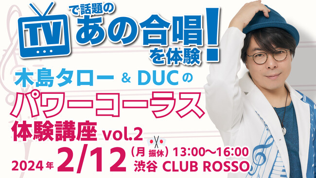 年末の音楽特番「オールスター合唱バトル」で話題となった “あの合唱” の編曲/指導者、木島タローによる【パワーコーラス体験講座】第二弾が、2月12日(月・祝)渋谷CLUB ROSSOにて開催される。今までの合唱バトルの楽曲の中から選りすぐりの名曲を使用し、木島タローの指導とDUCメンバーのサポートで短時間で効果的に学ぶ。