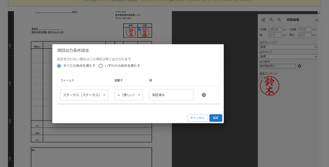 条件によるテンプレート制御:レコードのフィールド値に基づいてテンプレートの出力やフィールド値の出力を制御できます(プロセス管理のステータスに応じた印鑑画像の出し分けなどに利用できます)。