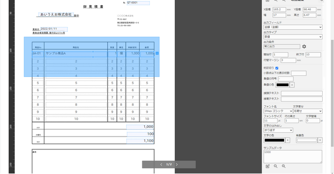 複数のテンプレートの登録:1つの帳票に複数のテンプレートを登録し、1度に複数の帳票を出力したり、フィールド値によってテンプレートを切り替えることができます(テーブルの行数に応じて、複数ページの帳票テンプレートに切り替えるなど)。