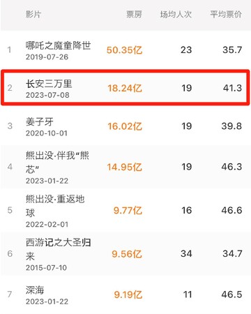中国アニメーション映画史上、歴代2位に浮上(1位は哪吒)。以下参考。