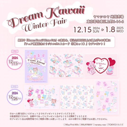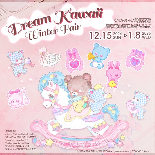ファンシー雑貨商品の企画・販売・イベント運営を行うユーモアラボ株式会社(所在地:東京都豊島区・代表:皆元 舞)は『Dream Kawaii Winter Fair 2024 in ヤマシロヤ』と題し、全国の人気ハンドメイド作家の作品を取り揃えたPOP UPを2024年12月15日(日)から2025年1月8日(水)までの期間、上野駅前の玩具専門店ヤマシロヤにて開催いたします。