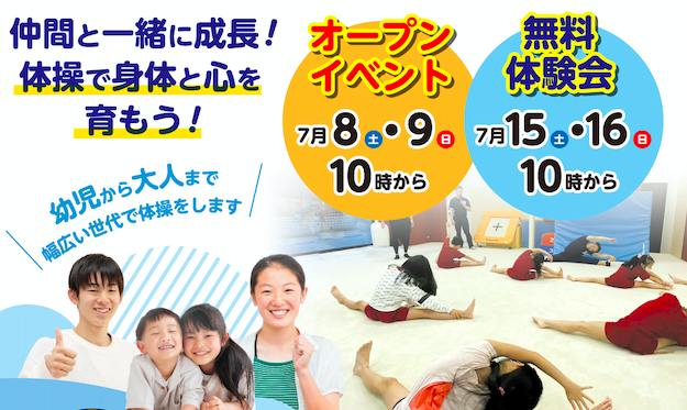 「Flying Bird 体操教室」では、2023年7月8,9日にオープンイベント、15,16日に無料体験会を開催し、体操の楽しさや魅力を体験できる企画を組んでいます!