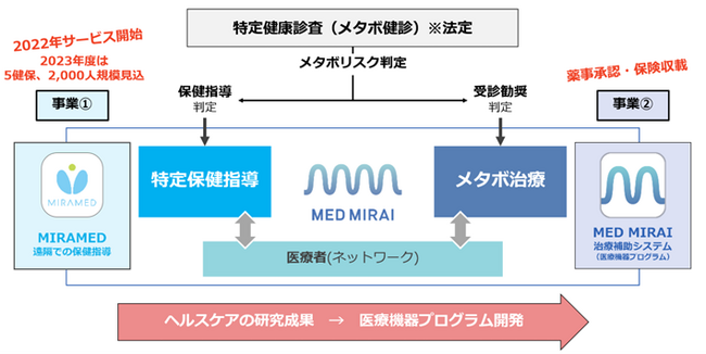 MED MIRAIは年度内の治験に向けて準備を進めてまいります。また、2022年より開始した遠隔特定保健指導は、すでに5健康保険組合への導入が決まっており、初年度は保健指導離脱率ゼロを実現しました。今後は健診センター等と連携し、健診と特定保健指導をトータルに提供するためのシステム構築を進めてまいります。中長期的には、個人に寄り添う「オンライン家庭医」を目指し、メタボの予防や保健指導、診断並びに服薬指導、そしてアフターケアまで、全て在宅で完結できる遠隔での総合的な保健医療サービスを開発・提供していきます。