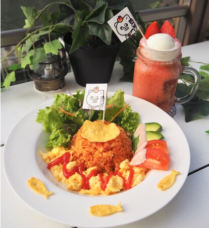 バターの芳醇な香り漂うケチャップライスとふわふわ卵が絶妙にマッチしたURIBOコラボオムライスです。お皿には魚モチーフの卵をあしらい、URIBOの愛らしさを表現いたしました。